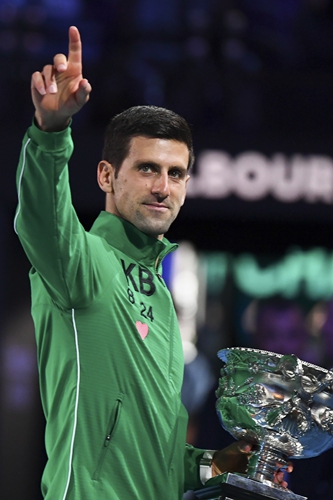 Novak Djokovic poses with the trophy following his victory against Dominic Thiem in their men's singles final match of the Australian Open in Melbourne early on Monday. Photo: AFP