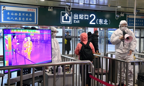 Staff members check passengers' temperature at the exit of Beijing West Railway Station in Beijing, capital of China, Jan. 28, 2020. (Xinhua/Ren Chao)
