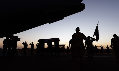 A handout picture taken on Saturday and released on Sunday by the SIRPA, the French army press service, shows French soldiers of the Barkhan force carrying the coffin of a soldier who died when two French military helicopters collided in Mali on November 25, in the French Army base in Gao. The crash occurred late on November 25, during an operation in the Liptako region, near the borders with Burkina Faso and Niger. It was the heaviest single loss for the French military in nearly four decades. Photo: AFP