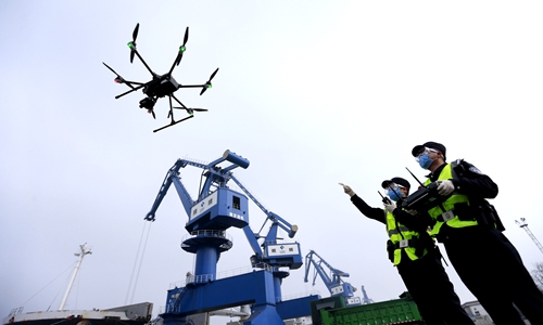 Police officers operate a drone to carry out inspections and remind workers to wear protective equipment at a port in Nanjing, East China's Jiangsu Province, on Monday. Photo: cnsphoto