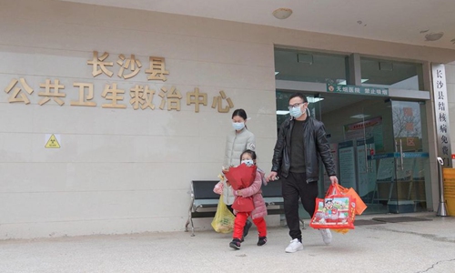 A 4-year-old patient leaves hospital with her parents in Changsha County, central China's Hunan Province, Feb. 1, 2020. The girl has been cured and discharged from the hospital. She is the first coronavirus-infected patient that was cured in Changsha County. (Photo by Zhang Di/Xinhua)