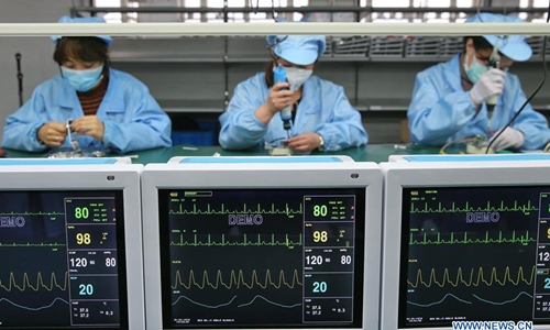 People work at a workshop of a medical equipment company in Qinhuangdao, north China's Hebei Province, Feb. 2, 2020. To help fight the outbreak of pneumonia caused by novel coronavirus, workers of many medical material companies rushed to work ahead of schedule. (Xinhua/Yang Shiyao)