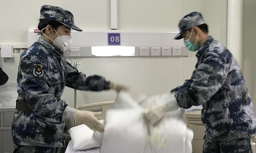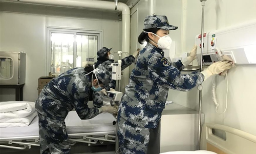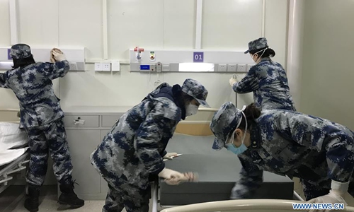 Medical staff test facilities and make the bed at Huoshenshan (Fire God Mountain) Hospital to make final preparations to admit patients infected with the novel coronavirus in Wuhan, central China's Hubei Province, Feb. 3, 2020. (Xinhua)