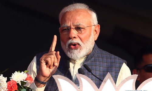 Indian Prime Minister Narendra Modi addresses his Bharatiya Janata Party's campaign rally in support of East Delhi candidates ahead of Delhi state elections in Delhi, India, Feb. 3, 2020. (Xinhua/Partha Sarkar)