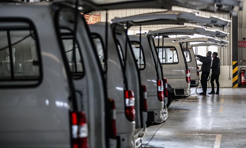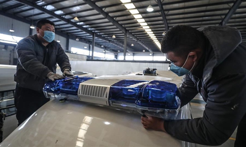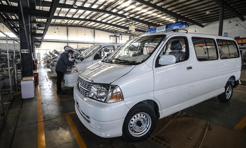 Workers produce ambulance at the manufacturing base of the Brilliance Auto company in Shenyang, northeast China's Liaoning Province, Feb. 3, 2020. In recent days, the company has rushed to produce negative pressure ambulances for the fight against the novel coronavirus epidemic. The production of the first batch of 10 negative pressure ambulances will be completed on Feb. 5 and then put into use. (Xinhua/Pan Yulong)