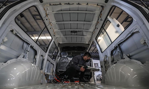 A worker produces ambulance at the manufacturing base of the Brilliance Auto company in Shenyang, northeast China's Liaoning Province, Feb. 3, 2020. In recent days, the company has rushed to produce negative pressure ambulances for the fight against the novel coronavirus epidemic. The production of the first batch of 10 negative pressure ambulances will be completed on Feb. 5 and then put into use. (Xinhua/Pan Yulong)