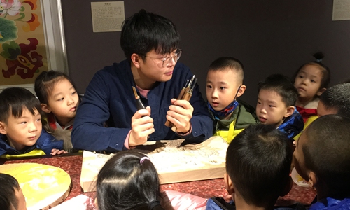 Xi Wang teaches local children Yangliuqing Woodblock Printing techniques, Jan. 10, 2020. (Photo provided to Xinhua)