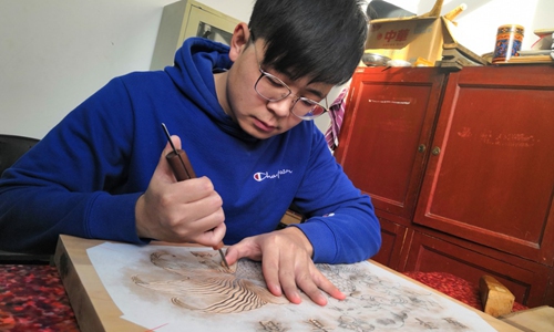 Xi Wang engraves wood in Tianjin, north China, Jan. 30, 2020. (Xinhua/Zhang Yuqi)
