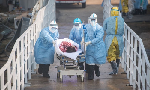 Medical workers help the first batch of patients infected with the novel coronavirus move into their isolation wards at Huoshenshan (Fire God Mountain) Hospital in Wuhan, central China's Hubei Province, Feb. 4, 2020. (Xinhua/Xiao Yijiu)