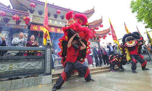 Lion dancers perform at the Thien Hau Temple in Los Angeles on February 5, 2019. Photo: IC