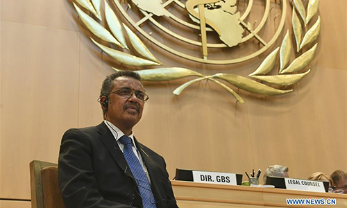 Newly elected Director-General of World Health Organization (WHO) Tedros Adhanom is pictured during the 70th World Health Assembly in Geneva, Switzerland, May 23, 2017. Tedros Adhanom, 52-year-old former health minister and foreign minister of Ethiopia, was elected on Tuesday as new Director-General of the World Health Organization, UN's health agency. (Xinhua/Alain Grosclaude)