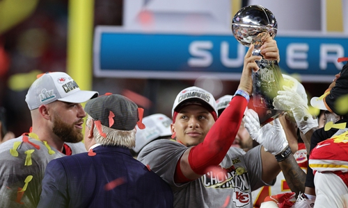 Patrick Mahomes of the Kansas City Chiefs celebrates after defeating the San Francisco 49ers in Super Bowl LIV on Sunday in Miami. Photo: AFP