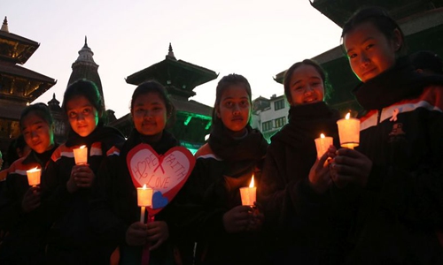 Nepalese students hold candles as they participate in a candle light vigil to mark the World Cancer Day at Patan Durbar Square in Lalitpur, Nepal, Feb. 4, 2020. (Xinhua/Sunil Sharma)