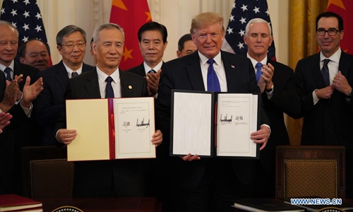 Chinese Vice Premier Liu He and US President Donald Trump show the signed China-US phase-one economic and trade agreement during a ceremony at the East Room of the White House in Washington D.C. on January 15. Photo: Xinhua