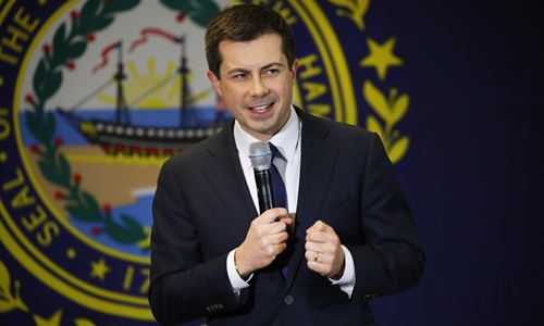 Democratic presidential candidate, South Bend, Indiana Mayor Pete Buttigieg speaks to supporters on Tuesday in Laconia, New Hampshire. Buttigieg holds a narrow lead over Senator Bernie Sanders (I-VT) in the Iowa Caucus after an app used by the state Democratic Party to count results caused overnight delays, according to published reports. Photo: AFP