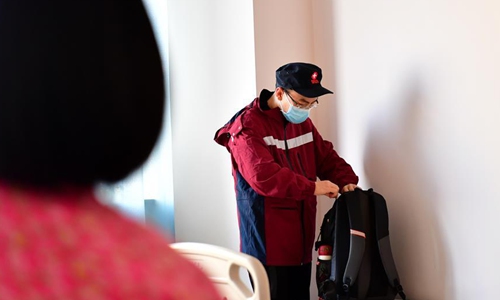Hao Tiedan packs his bag at a hospital in Taiyuan, north China's Shanxi Province, Feb. 4, 2020. Hao Tiedan is a member of the third batch of a medical team in Shanxi that has left for Hubei on Wednesday to fight against the novel coronavirus. His daughter was born just two days ago. Farewell to his wife and newborn daughter, Hao knows his daughter will be proud of him when she grows up. (Xinhua/Cao Yang)
