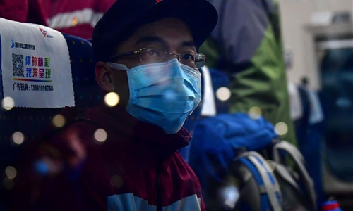 Hao Tiedan sits on a train bound for Hubei on Feb. 5, 2020. Hao Tiedan is a member of the third batch of a medical team in Shanxi that has left for Hubei on Wednesday to fight against the novel coronavirus. His daughter was born just two days ago. Farewell to his wife and newborn daughter, Hao knows his daughter will be proud of him when she grows up. (Xinhua/Cao Yang)