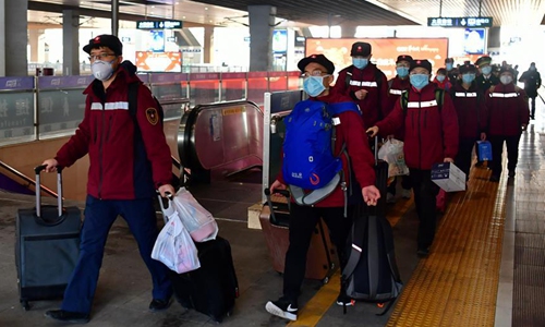 Hao Tiedan (2nd L) and his team members walk to board a train at Taiyuan South Railway Station in Taiyuan, north China's Shanxi Province, Feb. 5, 2020. Hao Tiedan is a member of the third batch of a medical team in Shanxi that has left for Hubei on Wednesday to fight against the novel coronavirus. His daughter was born just two days ago. Farewell to his wife and newborn daughter, Hao knows his daughter will be proud of him when she grows up. (Xinhua/Cao Yang)