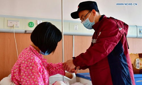 Hao Tiedan (R) gives massage to his wife Zhang Saihong in a hospital in Taiyuan, north China's Shanxi Province, Feb. 4, 2020. Hao Tiedan is a member of the third batch of a medical team in Shanxi that has left for Hubei on Wednesday to fight against the novel coronavirus. His daughter was born just two days ago. Farewell to his wife and newborn daughter, Hao knows his daughter will be proud of him when she grows up. (Xinhua/Cao Yang)