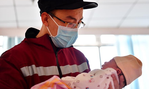 Hao Tiedan holds his daughter in hospital in Taiyuan, north China's Shanxi Province, Feb. 4, 2020. Hao Tiedan is a member of the third batch of a medical team in Shanxi that has left for Hubei on Wednesday to fight against the novel coronavirus. His daughter was born just two days ago. Farewell to his wife and newborn daughter, Hao knows his daughter will be proud of him when she grows up. (Xinhua/Cao Yang)
