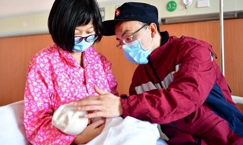 Hao Tiedan (R) sits beside his wife Zhang Saihong and their daughter in hospital in Taiyuan, north China's Shanxi Province, Feb. 4, 2020. Hao Tiedan is a member of the third batch of a medical team in Shanxi that has left for Hubei on Wednesday to fight against the novel coronavirus. His daughter was born just two days ago. Farewell to his wife and newborn daughter, Hao knows his daughter will be proud of him when she grows up. (Xinhua/Cao Yang)