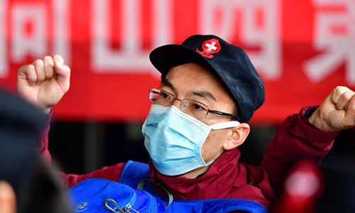 Hao Tiedan swears an oath at Taiyuan South Railway Station before leaving for Hubei, in Taiyuan, north China's Shanxi Province, Feb. 5, 2020. Hao Tiedan is a member of the third batch of a medical team in Shanxi that has left for Hubei on Wednesday to fight against the novel coronavirus. His daughter was born just two days ago. Farewell to his wife and newborn daughter, Hao knows his daughter will be proud of him when she grows up. (Xinhua/Cao Yang)