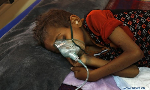 A boy cancer patient lies in a bed as he receives medical treatment at a cancer treating center in Sanaa, Yemen, on Feb. 4, 2020, the World Cancer Day. A WHO report in February 2019 estimated that number of cancer patients in Yemen reaches approximately 35,000. (Photo by Mohammed Mohammed/Xinhua)