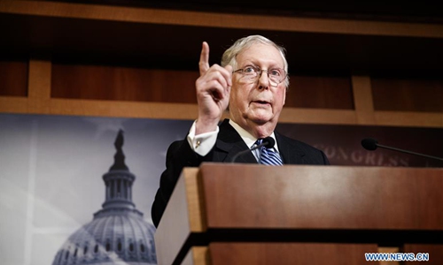 US Senate Majority Leader Mitch McConnell speaks during a press conference following a vote in the US Senate to acquit President Donald Trump on impeachment on Capitol Hill in Washington D.C., the United States, Feb. 5, 2020. U.S. President Donald Trump was acquitted on Wednesday afternoon by the Senate after the chamber voted down both articles of impeachment against him that the House approved late last year. (Photo by Ting Shen/Xinhua)