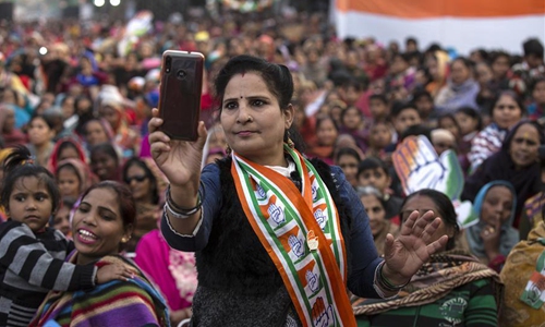 A supporter of Indian National Congress (INC) takes photos during an election campaign in New Delhi, India, Feb. 5, 2020. Campaigning for upcoming local elections here in the Indian capital reached a crescendo on Wednesday as different political parties are trying hard to woo voters to their side. (Xinhua/Javed Dar)