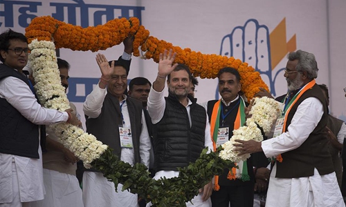 Indian National Congress (INC) leader Rahul Gandhi (C) along with his party leaders wave towards their supporters during an election campaign in New Delhi, India, Feb. 5, 2020. Campaigning for upcoming local elections here in the Indian capital reached a crescendo on Wednesday as different political parties are trying hard to woo voters to their side. (Xinhua/Javed Dar)