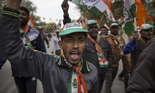 Supporters of Indian National Congress (INC) shout slogans during an election campaign in New Delhi, India, Feb. 5, 2020. Campaigning for upcoming local elections here in the Indian capital reached a crescendo on Wednesday as different political parties are trying hard to woo voters to their side. (Xinhua/Javed Dar)