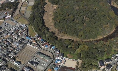 Aerial photo taken on Feb. 4, 2020 shows a part of a mounded tomb (R) from Mozu-Furuichi Kofun Group in Osaka Province, Japan. (Xinhua/Du Xiaoyi)