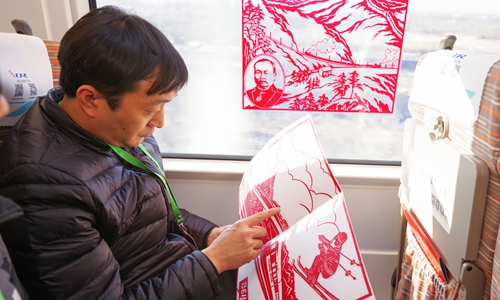 A passenger looks through paper-cut works as he rides the Beijing-Zhangjiakou high-speed railway on December 30, 2019. Photo: CNSphoto