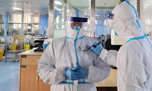 Photo taken with a mobile phone on Feb. 5, 2020 shows a doctor writting the name on the protective suit for Peng Zhiyong (L), the director of the intensive care unit, at an isolation ward in Zhongnan Hospital of Wuhan University in Wuhan, central China's Hubei Province. Health workers write names on their protective suits for each other for the sake of recognition in the isolation wards. (Photo by Zhong Nanxuan/Xinhua)