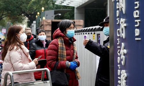 Staff measures the body temperature at the entrance of a hospital in Shanghai, East China, February 3, 2020. Various measures are taken across China to combat the novel coronavirus. Photo: Xinhua