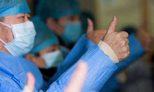Cured novel coronavirus pneumonia patients cheer for themselves in a hospital in Wuhan, central China's Hubei Province, Feb. 6, 2020. (Xinhua/Li He)
