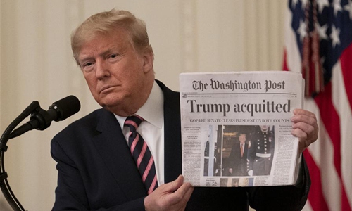 US President Donald Trump holds up a copy of The Washington Post at the White House in Washington D.C., the United States, on Feb. 6, 2020. Donald Trump took a victory lap Thursday, a day after a divided Senate voted to acquit him on impeachment charges. (Xinhua/Liu Jie)