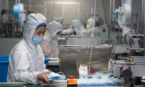 Workers make protective masks at the workshop of a company in Jinxian County, east China's Jiangxi Province, Feb. 1, 2020. To help fight the outbreak of pneumonia caused by novel coronavirus, workers of many medical material companies rushed to work ahead of schedule to make protective equipment. (Xinhua/Wan Xiang)
