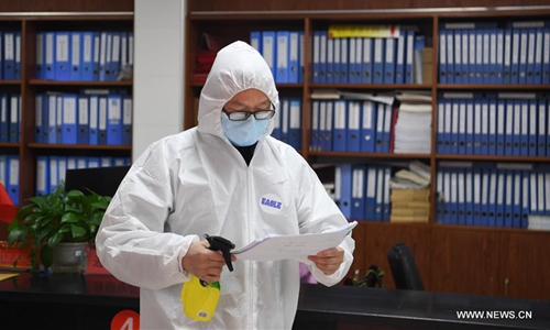 A community worker checks residents' information in Caidian District of Wuhan, central China's Hubei Province, Feb. 7, 2020. Wuhan, the epicenter of the novel coronavirus outbreak, is combing communities to ensure every confirmed or suspected patient is located and attended to. (Xinhua/Cheng Min)