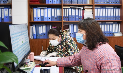 Community workers record residents' health information in Caidian District of Wuhan, central China's Hubei Province, Feb. 7, 2020. Wuhan, the epicenter of the novel coronavirus outbreak, is combing communities to ensure every confirmed or suspected patient is located and attended to. (Xinhua/Cheng Min)