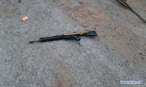 A rifle used by the alleged killer is seen in Nakhon Ratchasima province, Thailand, Feb. 8, 2020. A Thai soldier has killed at least 12 people in the north-eastern province of Nakhon Ratchasima, local media reported Saturday. (Xinhua)