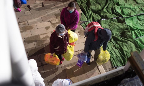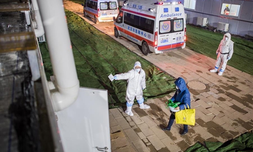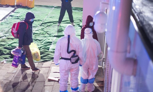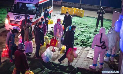 Patients enter the ward of Leishenshan (Thunder God Mountain) Hospital in Wuhan, capital of central China's Hubei Province, Feb. 8, 2020. The makeshift hospital received its first batch of patients of the novel coronavirus pneumonia Saturday night. (Xinhua/Xiao Yijiu)