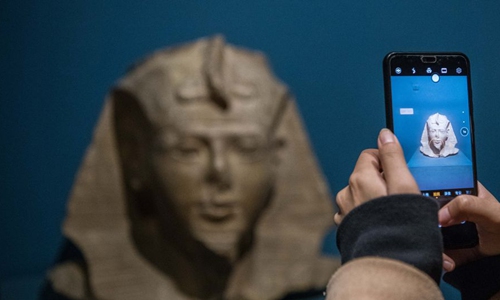 A visitor takes photos of a statue in Mallawi Museum, Minya province, Egypt, on Jan. 30, 2020. (Xinhua/Wu Huiwo)