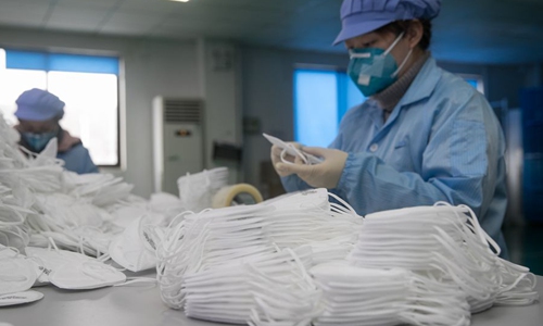 Workers count masks at Shanghai Yuanqin Purification Technology Co., Ltd. in Shanghai, east China, on Jan. 26, 2020. (Xinhua/Ding Ting)