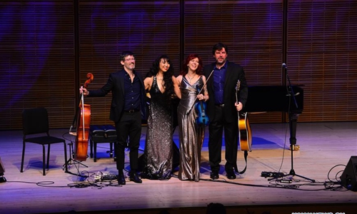 Violinist Deni Bonet (2nd R) and her band greet the audience at the sixth annual Spectacular concert in Zankel Hall at Carnegie Hall in New York, the United States, on Feb. 7, 2020. More than 500 New Yorkers enjoyed a brilliant concert celebrating the Year of the Rat at Carnegie Hall in New York City (NYC) on Friday night. (Photo by Zhan Zehu/Xinhua)