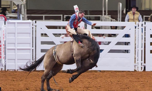 A cowboy is seen in the rodeo competition at Fort Worth Stock Show and Rodeo in Fort Worth, Texas, the United States, on Feb. 7, 2020. The Fort Worth Stock Show and Rodeo 2020 runs from Jan. 17 to Feb. 8. An average of over 900,000 people visit the Fort Worth Stock Show and Rodeo annually. (Photo by Dan Tian/Xinhua)