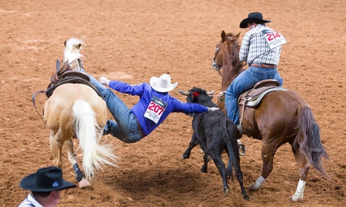 Cowboys are seen in the rodeo competition at Fort Worth Stock Show and Rodeo in Fort Worth, Texas, the United States, on Feb. 7, 2020. The Fort Worth Stock Show and Rodeo 2020 runs from Jan. 17 to Feb. 8. An average of over 900,000 people visit the Fort Worth Stock Show and Rodeo annually. (Photo by Dan Tian/Xinhua)