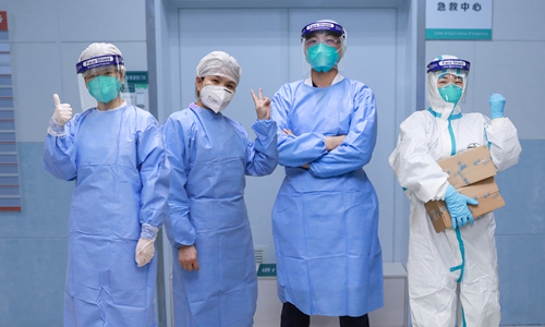 Health workers (L-R) Bai Hui, Li Chunfang, Zhao Zhigang and Guo Qin, who have recovered from recent novel coronavirus infections, pose for a group photo at the emergency medical center of Zhongnan Hospital of Wuhan University in Wuhan, central China's Hubei Province, Feb. 6, 2020. (Photo by Gong Yong/Xinhua)