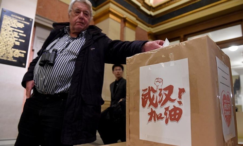 A man donates after the 2020 Gala concert for Chinese New Year at the golden hall of Vienna's Musikverein in Vienna, Austria, Feb. 4, 2020. The 2020 Gala concert for Chinese New Year was held in the Golden Hall in Vienna, Austria on Tuesday evening. This concert also launched a fundraising event for the fight against the coronavirus outbreak in China. (Xinhua/Guo Chen)