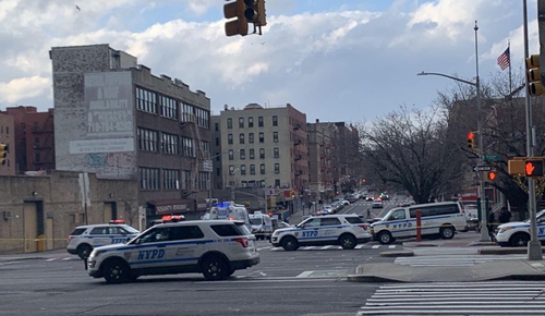 Police vehicles are seen near the site where a gunman opened fire in The Bronx of New York, the United States, on Feb. 9, 2020. (Xinhua/Wang Jiangan